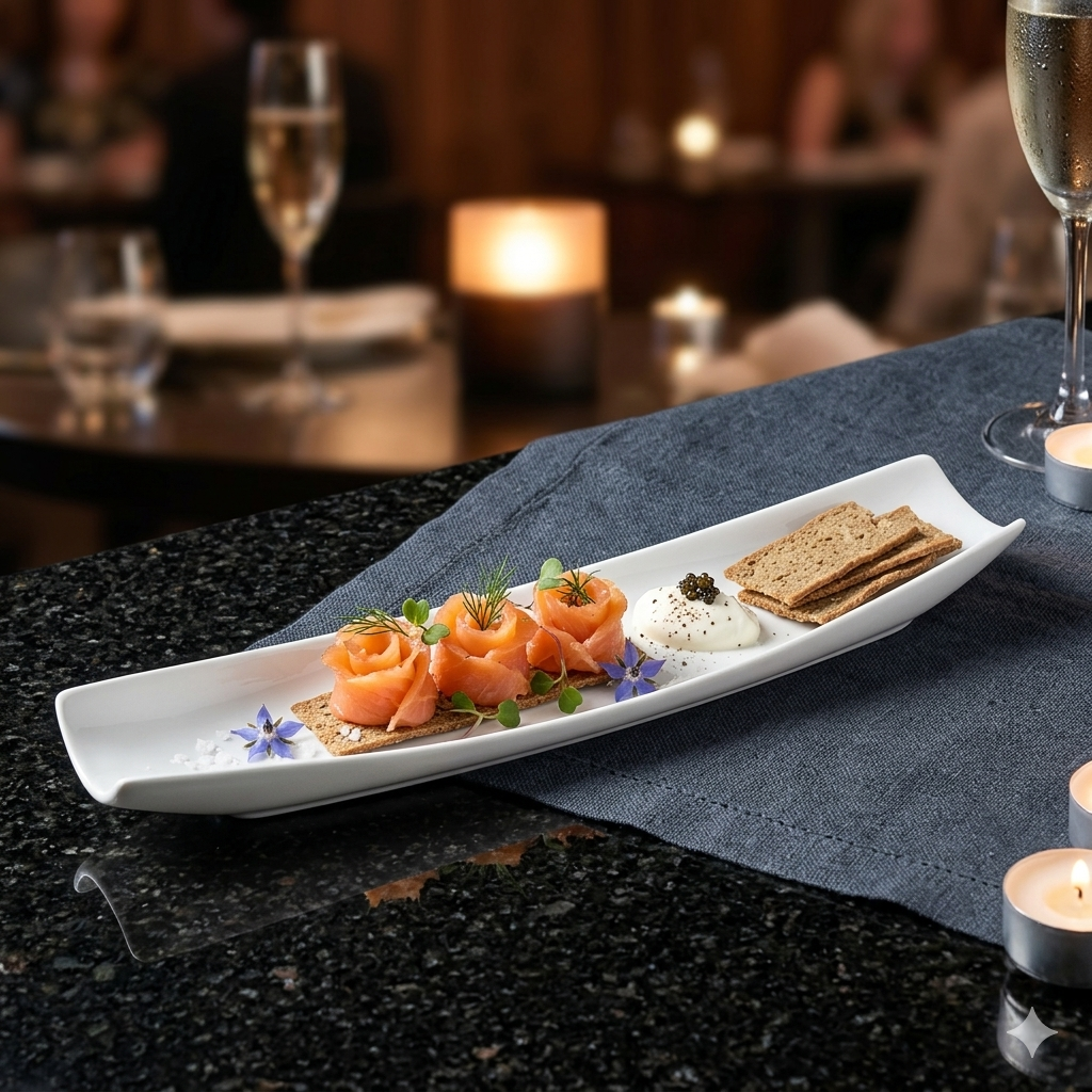 La fuente rectangular Wilmax England destaca por su porcelana fina de alta durabilidad y diseño alargado de 40×13 cm, ideal para servir sushi, aperitivos o postres con un acabado elegante.